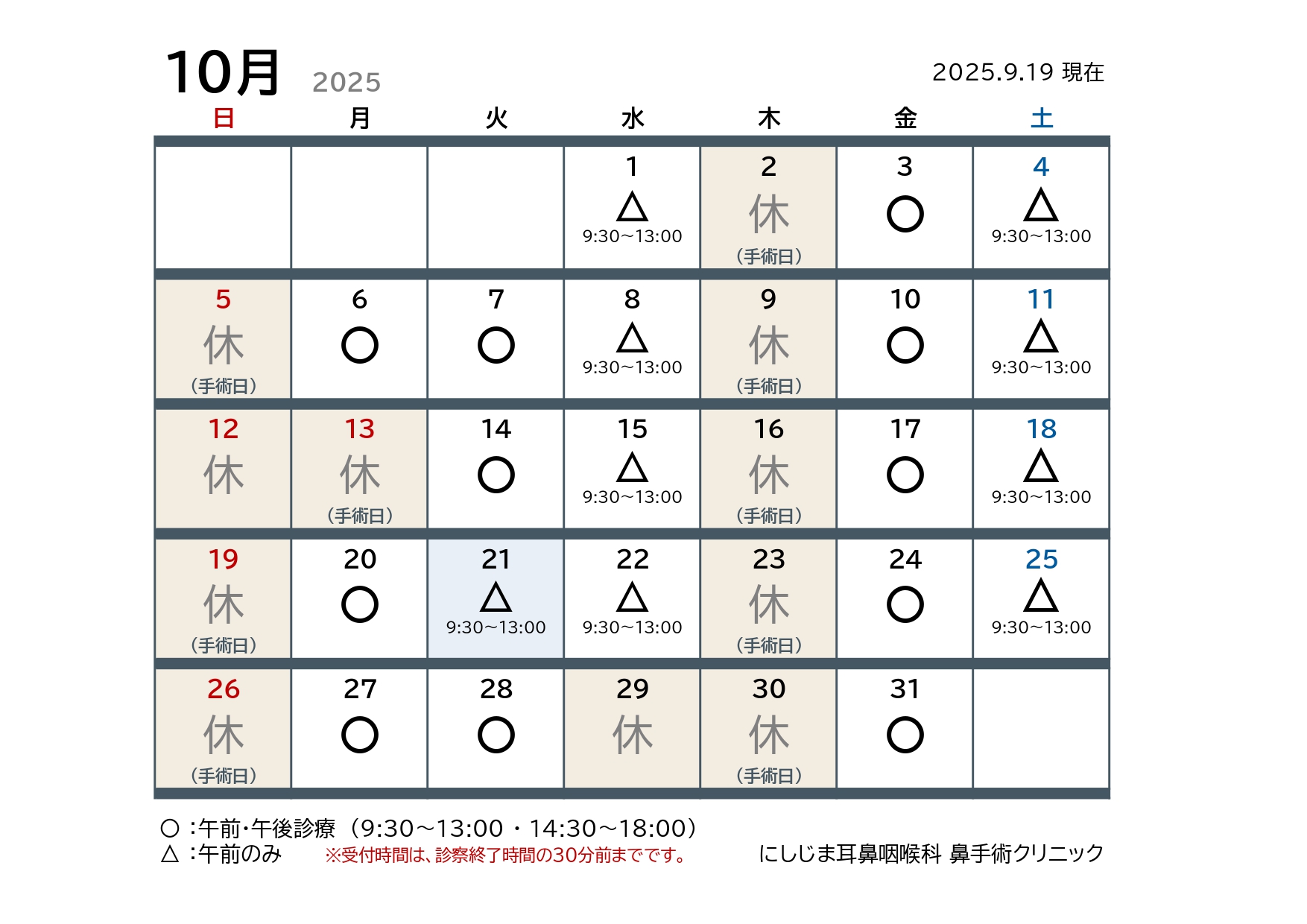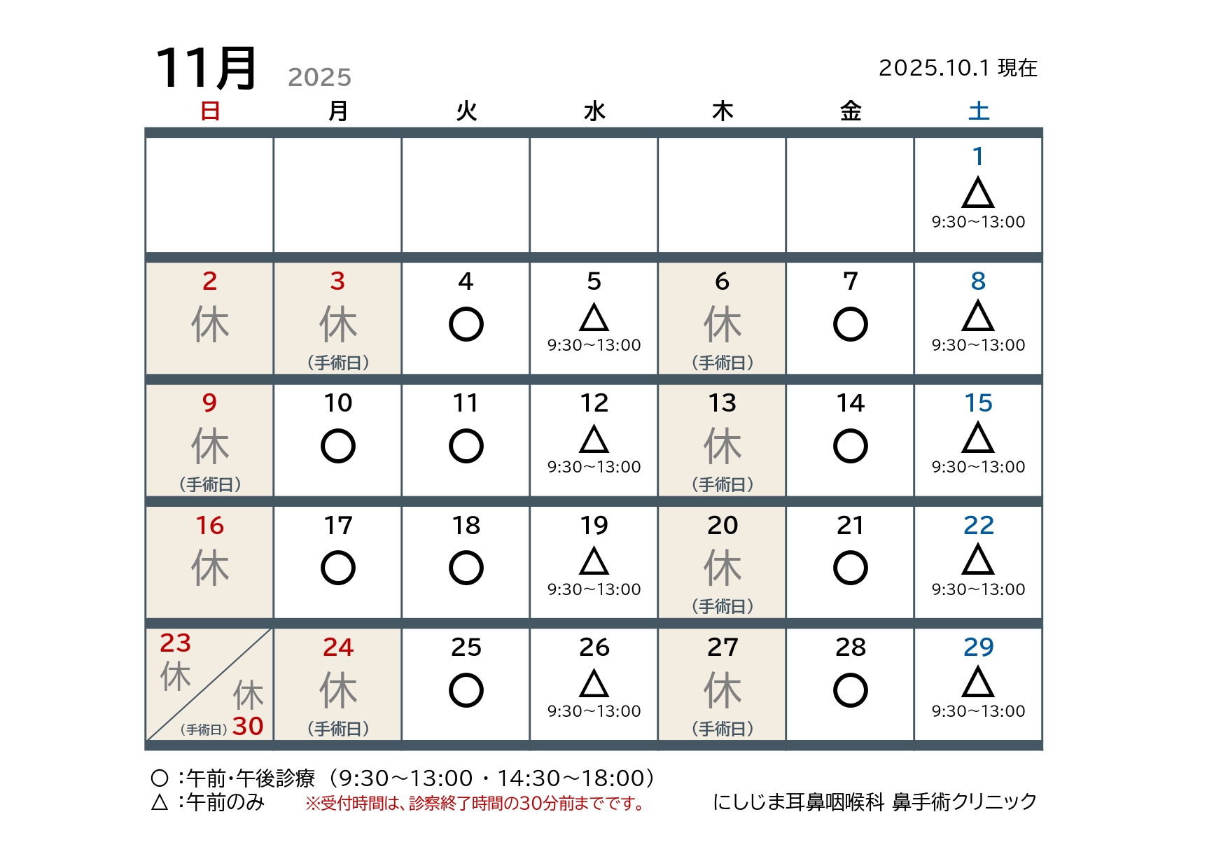 しばらくの間は初診の患者様が多いため、通常よりお待ちいただく場合がございますが、スタッフ一同、日々研鑽を重ね、より良い医療の提供に努めてまいります。何卒ご理解いただきますようお願い申し上げます。なお、祝日および振替休日は休診とさせていただきますので、次回の診療は11月5日(火)となります。よろしくお願いいたします。